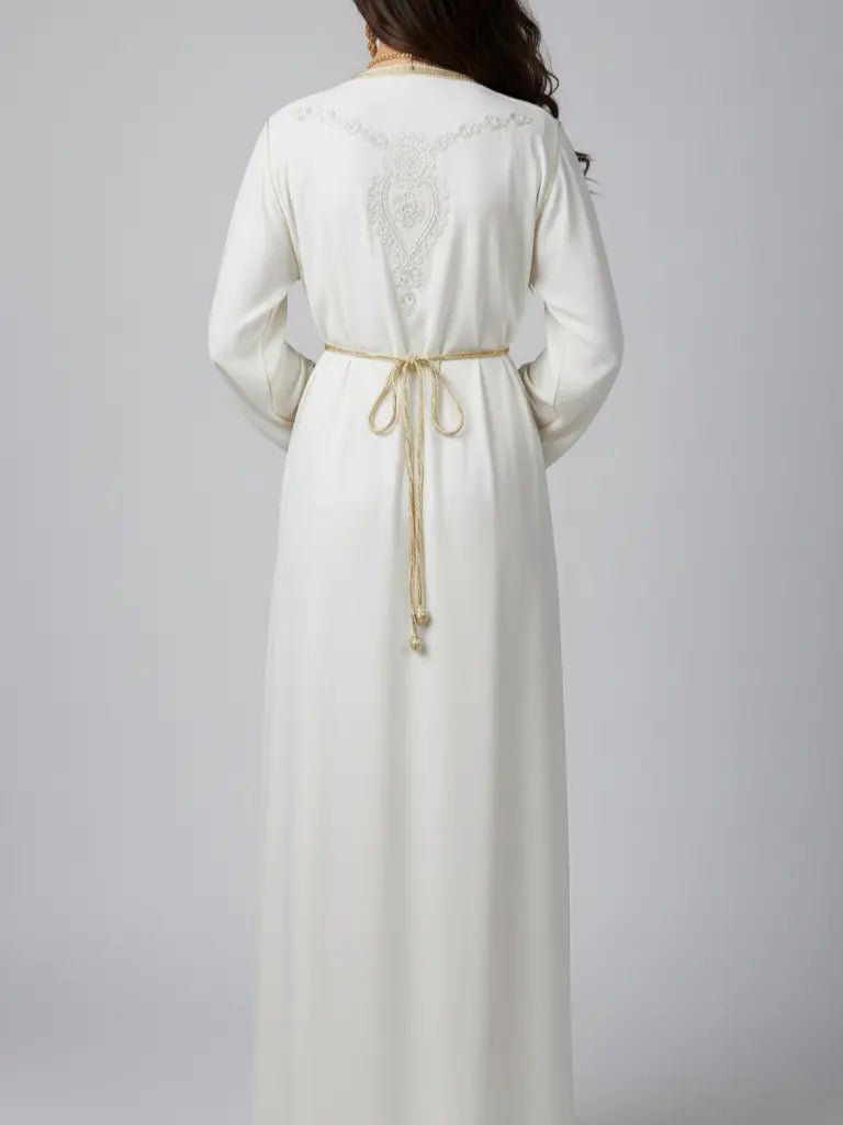 قطعة تبهر الأنظار—فهذا القفطان الأبيض يعكس روعة القفطان المطرز بالخرز، ومصمم للعروس العصرية التي تقدّر الجمال، التقليد، والفخامة.